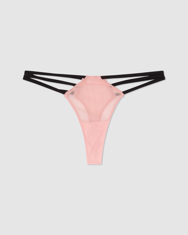 The Mesh Strappy Thong in Powder Pink brings both comfort and elegance. This mid-rise string has the versatility to be worn high in the waist or lower on the hips, providing you with an excellent fit. The unique design includes cut out side panels for minimum coverage at the front and back.