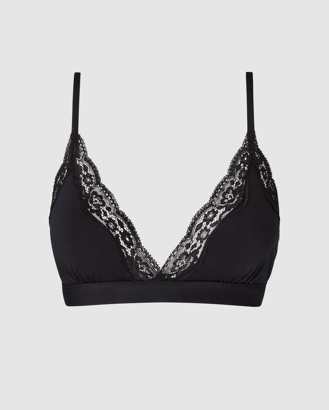 The Micro Lace Triangle Bralette in black by UNDERSTATEMENT deftly combines comfort with femininity. Crafted from an innovative Peach Stretch™ fabric, the bralette ensures unprecedented comfort. Recycled microfiber imbues the piece with a soft, buttery texture and a luscious, peachy finish. The ultra-stretchy material ensures maximum flexibility and the epitome of comfort.