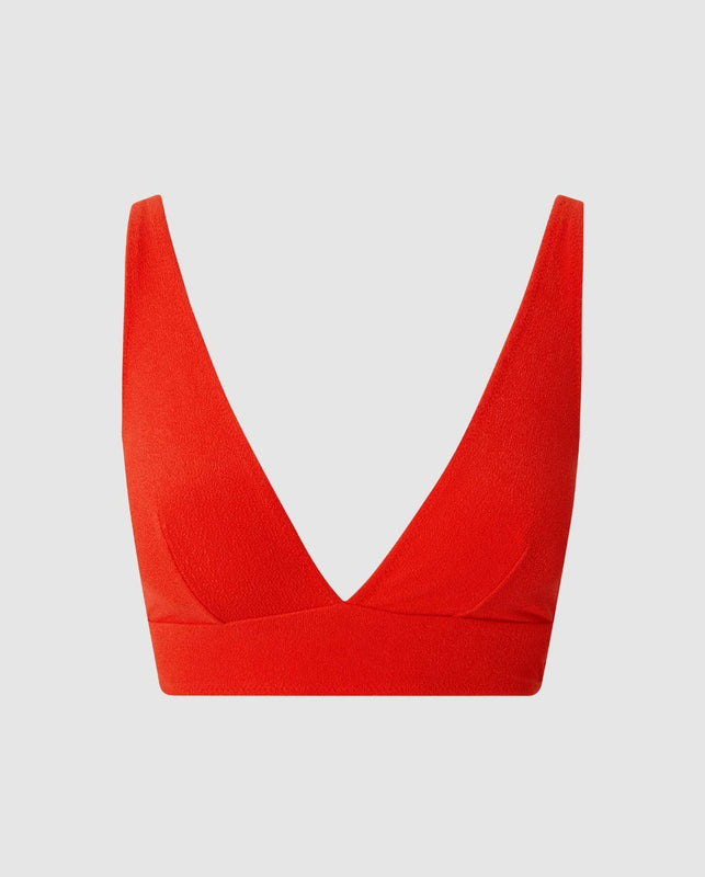 Slip-on bikini top with plunging cups and a wider underband. Lined with lightweight microfiber. Adjustable shoulder straps. Metal coin with Understatement symbol at back.