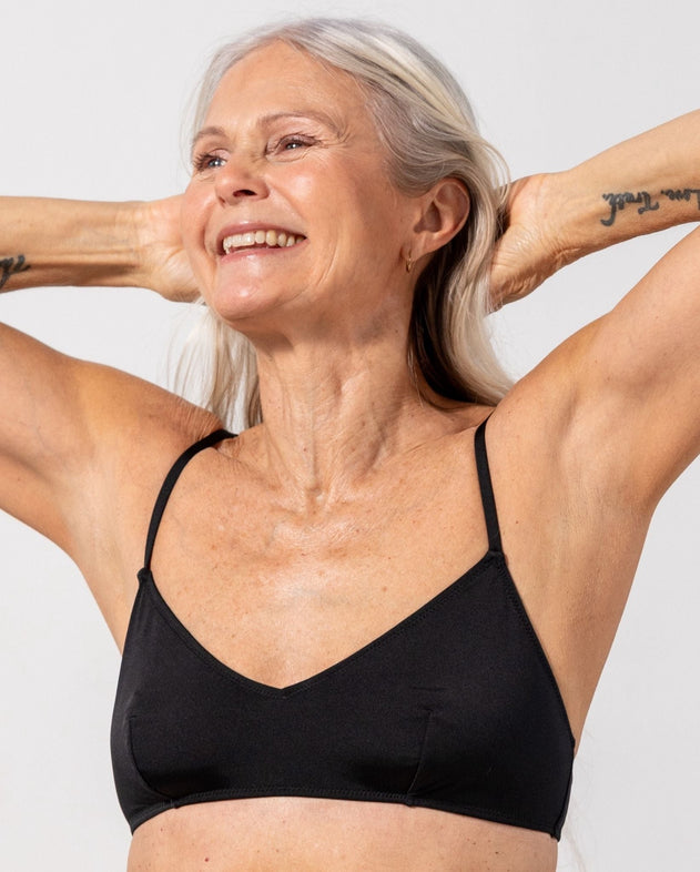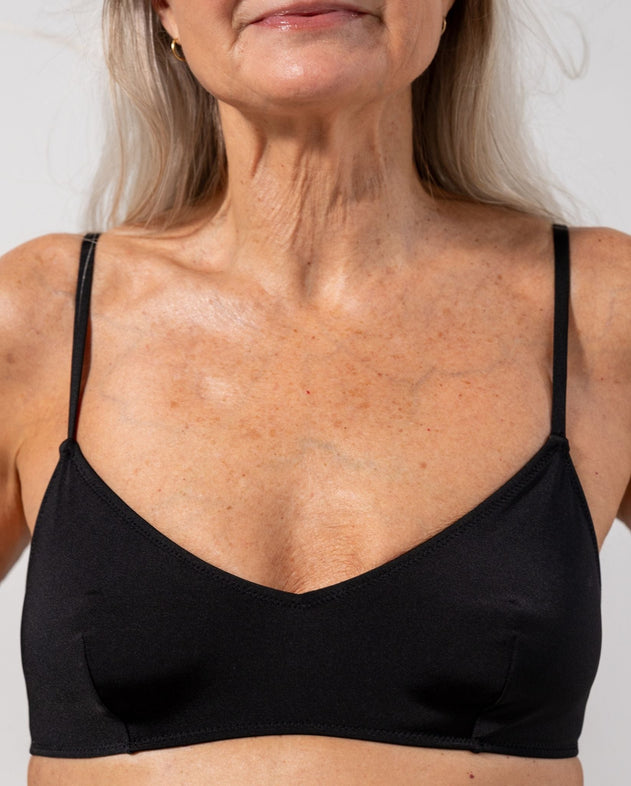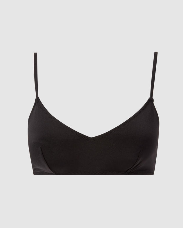 Clean lines, timeless style. Smooth swimwear fabric made from recycled polyamide. Scooped bikini top with an adjustable back closure. Thin, adjustable shoulder straps for a perfect fit. Printed Understatement logo at the back.