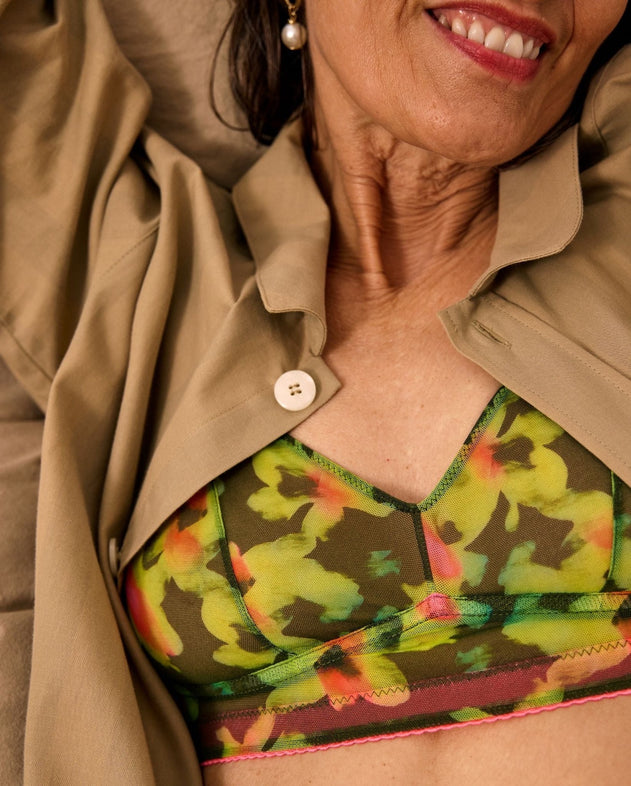 Balconette-shaped cups in sheer mesh with a built-up center-front. With a wider back with adjustable hook & eye closure and adjustable shoulder straps. Soft, non-itchy silicon care label.