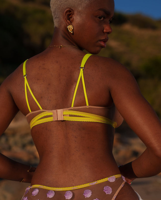 The Mesh Triangle Bralette delivers full-on comfort in semi-sheer mesh, featuring shell-shaped patches at the cups for a delicate touch. With triangle cups, an elastic underband, and double adjustable straps at the back, it offers light support with a sleek silhouette. Finished with silver Understatement-engraved rings and a soft silicone care label for itch-free wear.