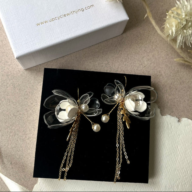 These earrings feature upcycled PET plastic creating the flowers as well as metallic leaves and chains that have a stunning gold-toned finish for an elegant touch.