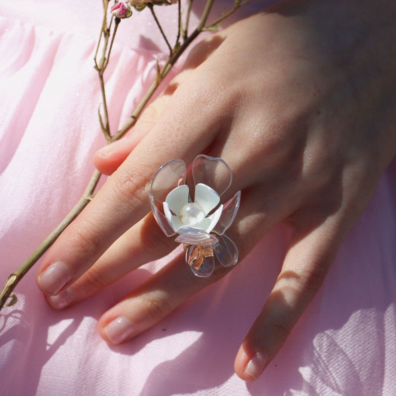Stunning floral ring with sophisticated style. Dangling off gold-finished French hooks are beautiful clear flowers that cradle a lustrous white bead with a rounded gold-finish tip. Just the ring you need when you want to say a lot, without saying too much!