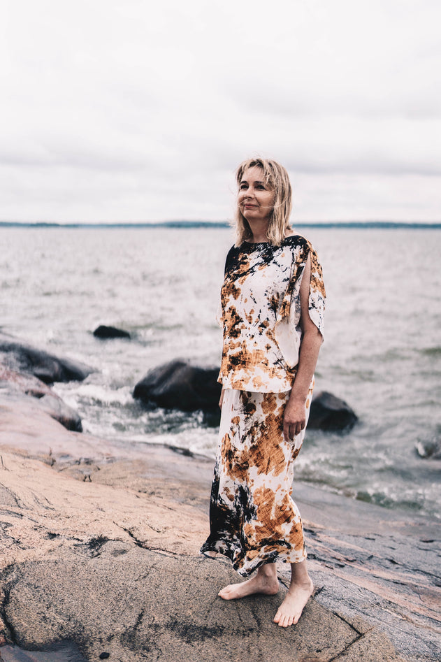 The Vallmo blouse is feminine and timelessly stylish. The sleeve slits extend to the shoulder, adding a beautiful detail that brings lightness and character. Made from 100% EcoVero, a responsibly produced and breathable material, the blouse drapes elegantly. The Vallmo blouse is suitable for both everyday wear and special occasions. Pairing the Vallmo blouse with Svartholm pants in the same material creates a lovely coordinated outfit.