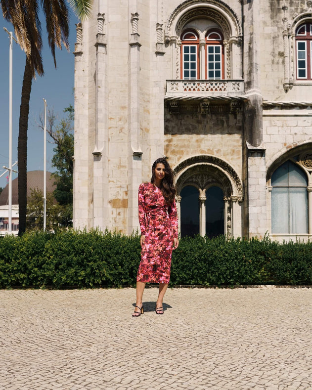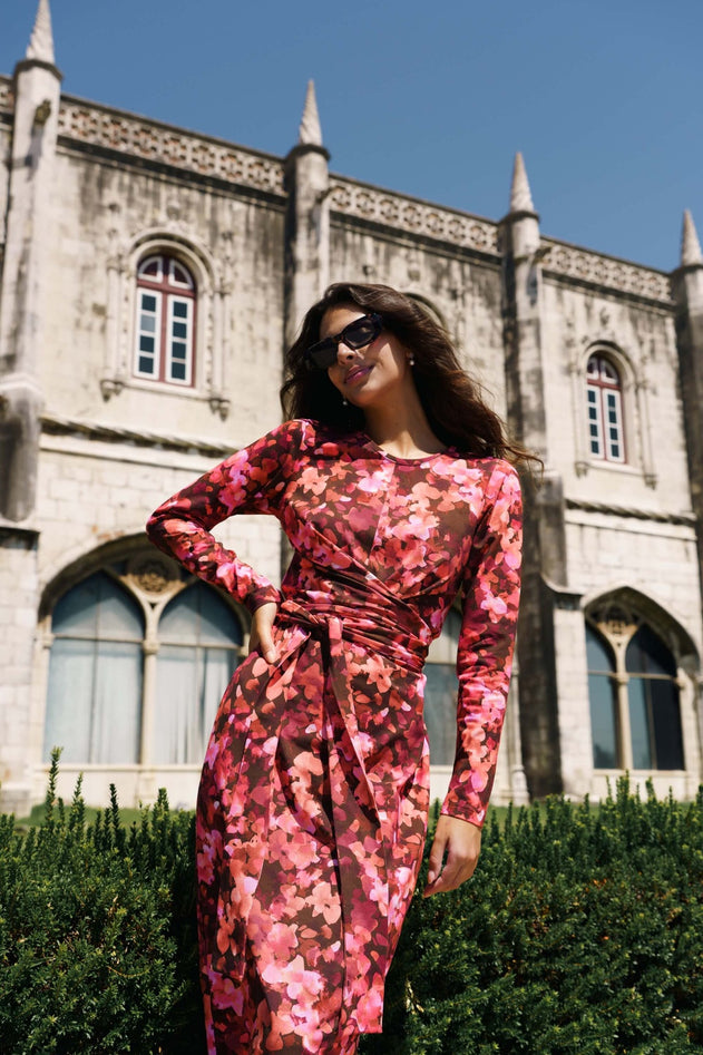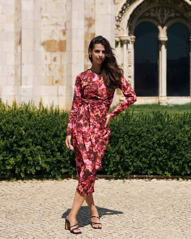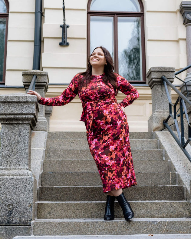 The close-fitting cut highlights your best features, while the midi hem creates an elegant and versatile look. The beautiful detail of the dress is the tie belt that creates a wrap style silhouette.